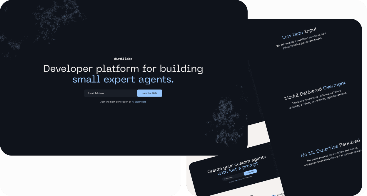 Splash landing page for distil labs. Helped gain initial traction, get hundreds of signups for the waitlist and close seed round.
